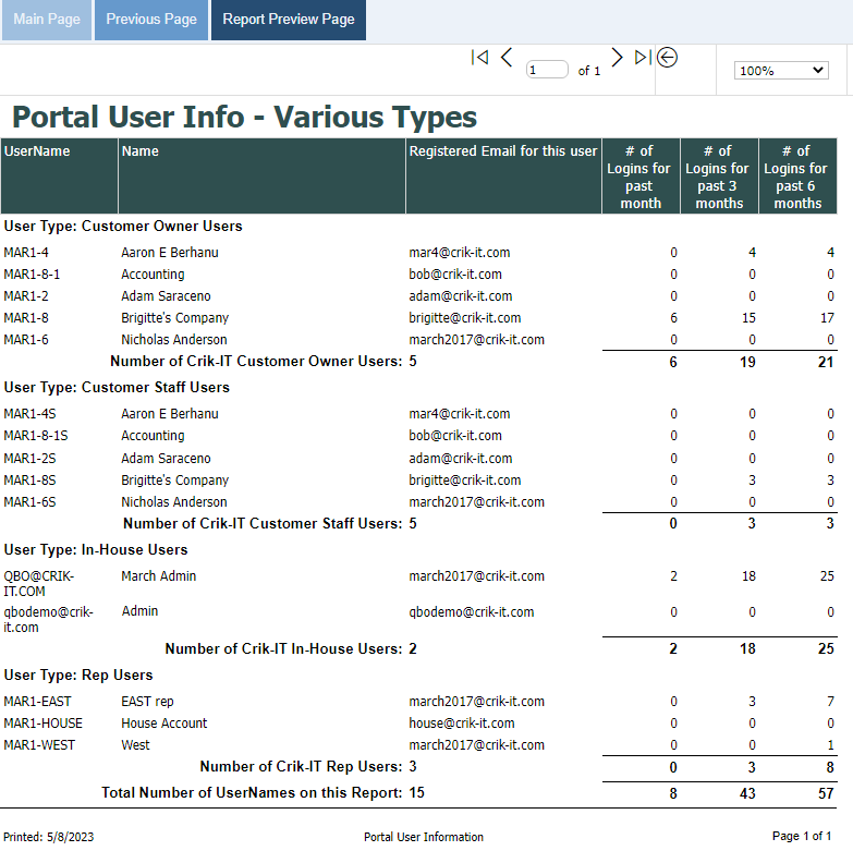 You will see usernames broken down by user type. Note that a customer "staff" username is automatically set up when you create a username for one of your customers. "Staff" usernames do not count towards your user count totals for billing purposes.