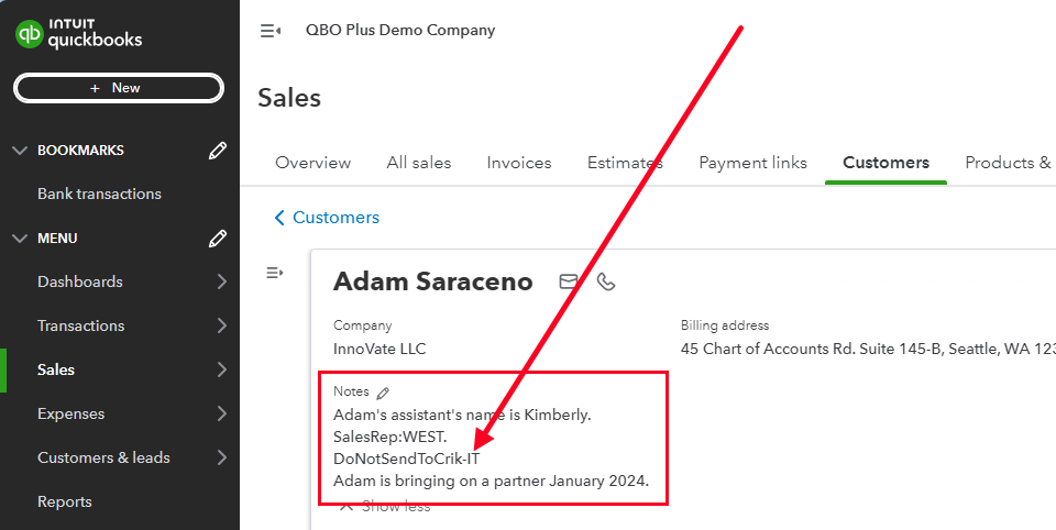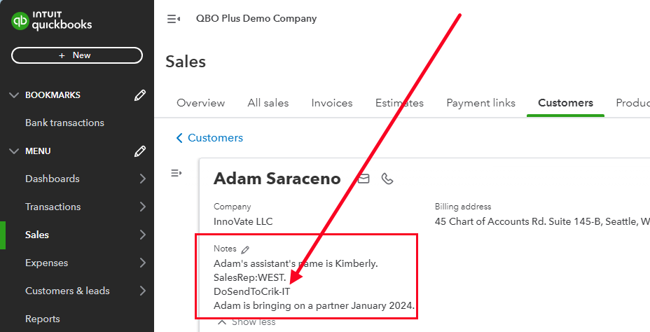 Then, here's how you should set up a customer in QuickBooks Online that SHOULD be sent to Crik-IT.