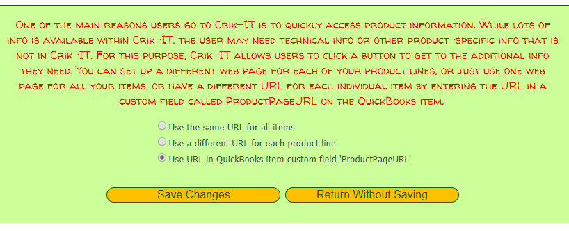 You can configure Crik-IT to make it easy for your users to access detailed product information with a click of the mouse. You can define one URL to use for ALL products, or one URL to use for each of your product lines, or a different URL for each individual product.