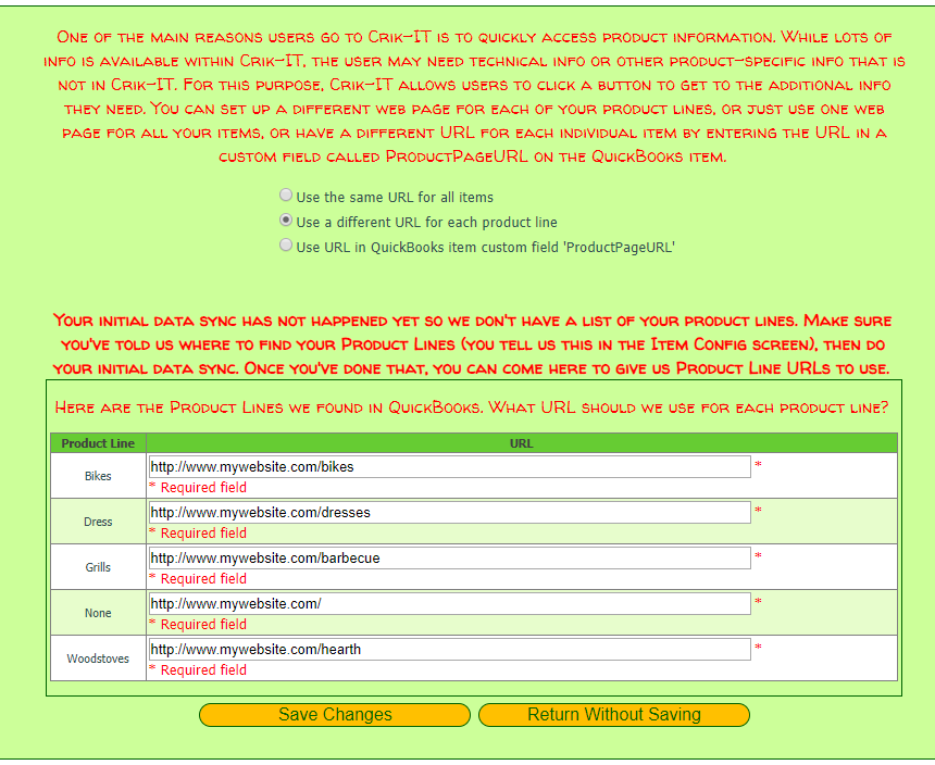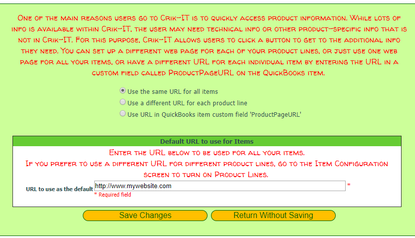 The third option allows you to use a different URL for each item. This option involves using a QuickBooks custom field called ProductPageURL on your QuickBooks items.