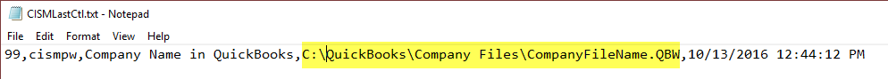 - Edit C:\ProgramData\CrikITSyncer\CISMLastCtl.txt. Replace the text between the 3rd and 4th commas (highlighted below) with the QuickBooks company file location you copied in the step above. Then save your changes.