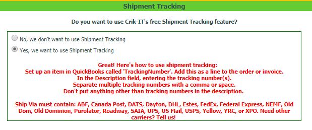 - Go to the Shipment Tracking section at the bottom of the page. Click "Yes, we want to use Shipment Tracking". Follow the instructions for how to use this feature that appear.