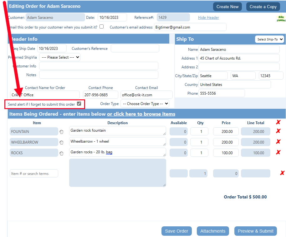 If an order was entered more than 24 hours ago, AND if the order has the "Send alert if I forget to submit this order" checkbox checked, AND if the order has not yet been submitted, Crik-IT will send a reminder email to the Contact Email address entered on the order.